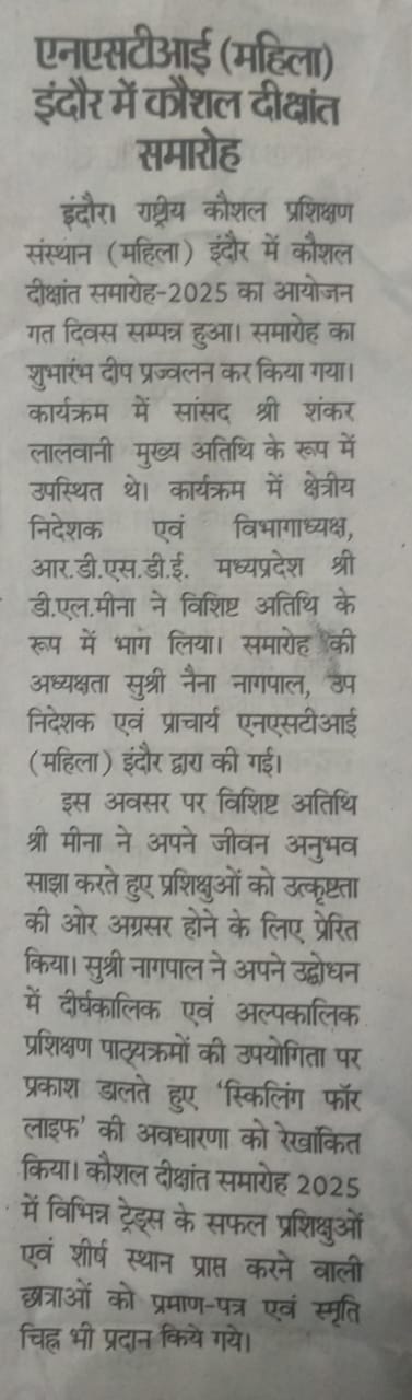 National Skill Training Institute for Women, Indore  is imparting Vocational Training with skills as required by the Local Industry and providing need-based training to trainees to become Entrepreneurs. National Skill Training Institute comes under the Government of India, Ministry of Skill Development & Entrepreneurship, Women’s Training Cell under Directorate General of Training. This premier institute for women facilitates regular long-term training courses and short-term training programmes in various disciplines. Long-term courses are conducted in levels such as Craftsmen Training Scheme (CTS), Craft Instructor Training Scheme (CITS), and the recently started Advanced Diploma in IT, Networking, and Cloud course. These courses are essential in the current scenario due to high demand in software industries where every industry uses the cloud as a base.
